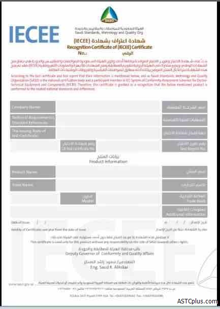 The Saudi Organization for Standardization, Metrology and Quality (SASO) grants a certificate of recognition of the international certificate issued according to the IECEE scheme, as this certificate is considered an approval of the international IECEE certificate and test report, taking into consideration that the product complies with Saudi requirements.