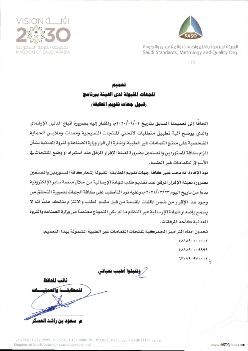 SASO requires importers and manufacturers to follow the regulations for textile products and personal protection equipment and clothing on the product of non-medical masks, and a reference to the decision of the Ministry of Industry and Mineral Resources regarding obligating all importers and manufacturers to fill The attached declaration when importing or placing products on the market for non-medical masks.