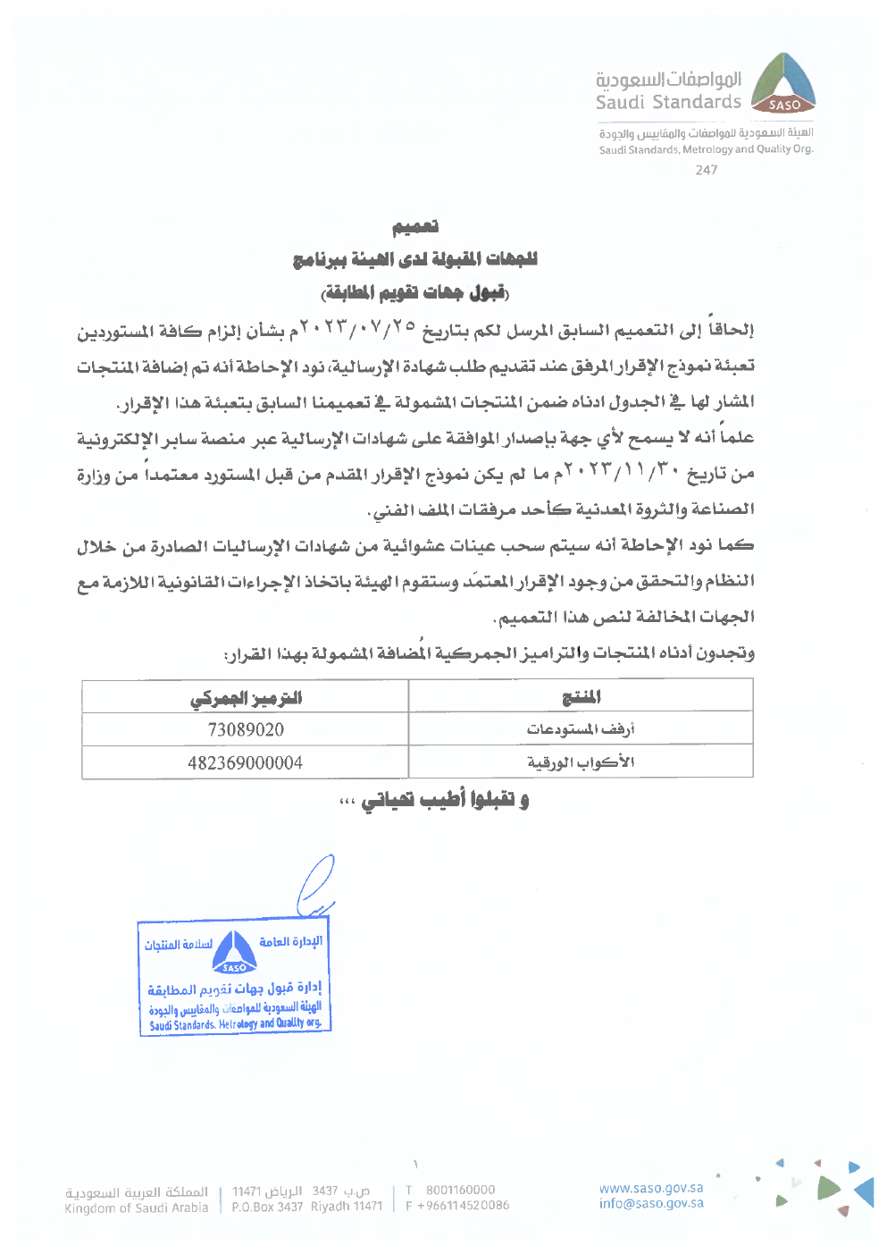 According to the SASO notification, starting from Nov. 30, 2023, for shelves and Cup of paperboard, applicants must provide a declaration from the Ministry of Industry and Mining and obtain their approval when applying for a product certificate or shipment certificate through the SABER system.